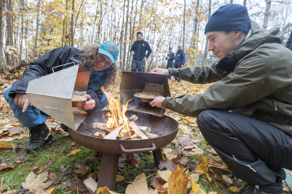 Efter övningarna i naturreservatet väntade tillagning av soppa och bröd på mattan av gula höstlöv. Äppelpaj bakad i reflektorugn över öppen eld satte sedan guldkant på lunchen.